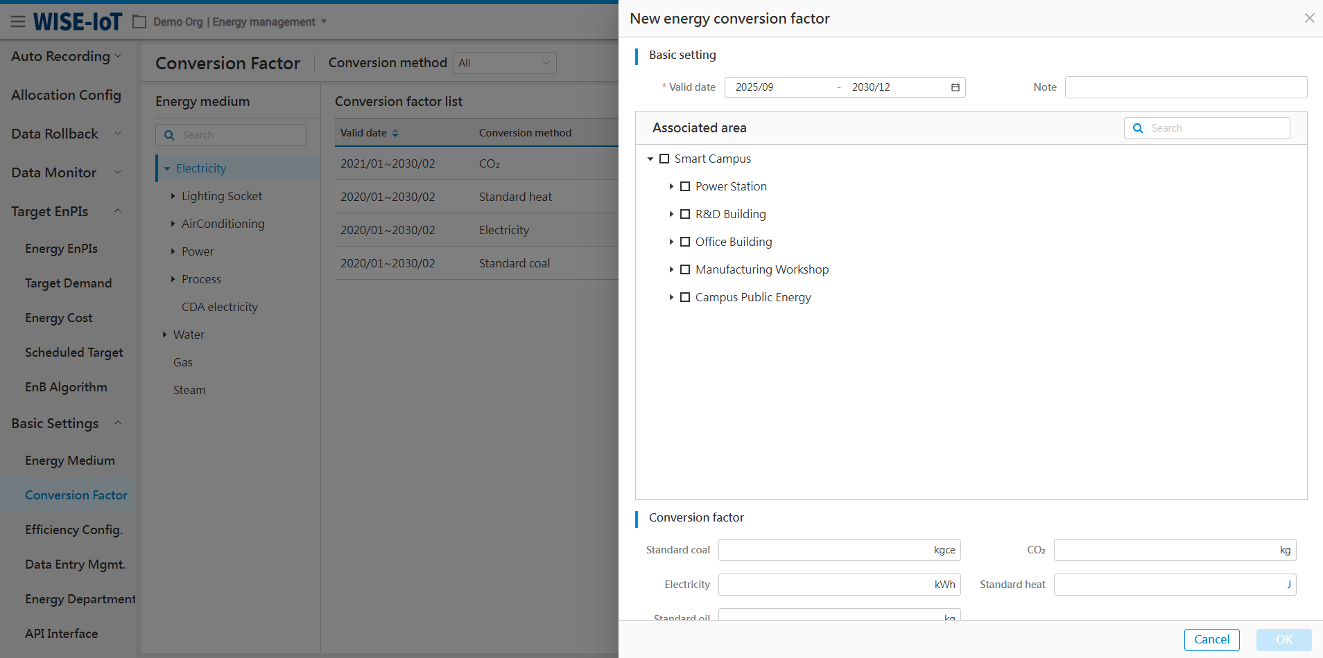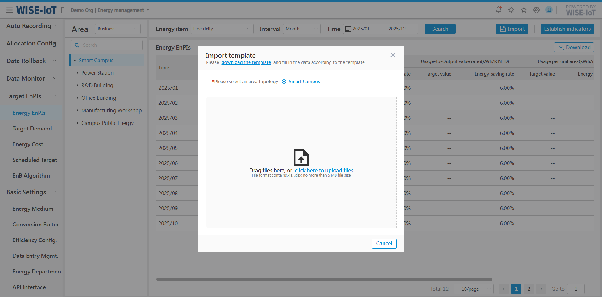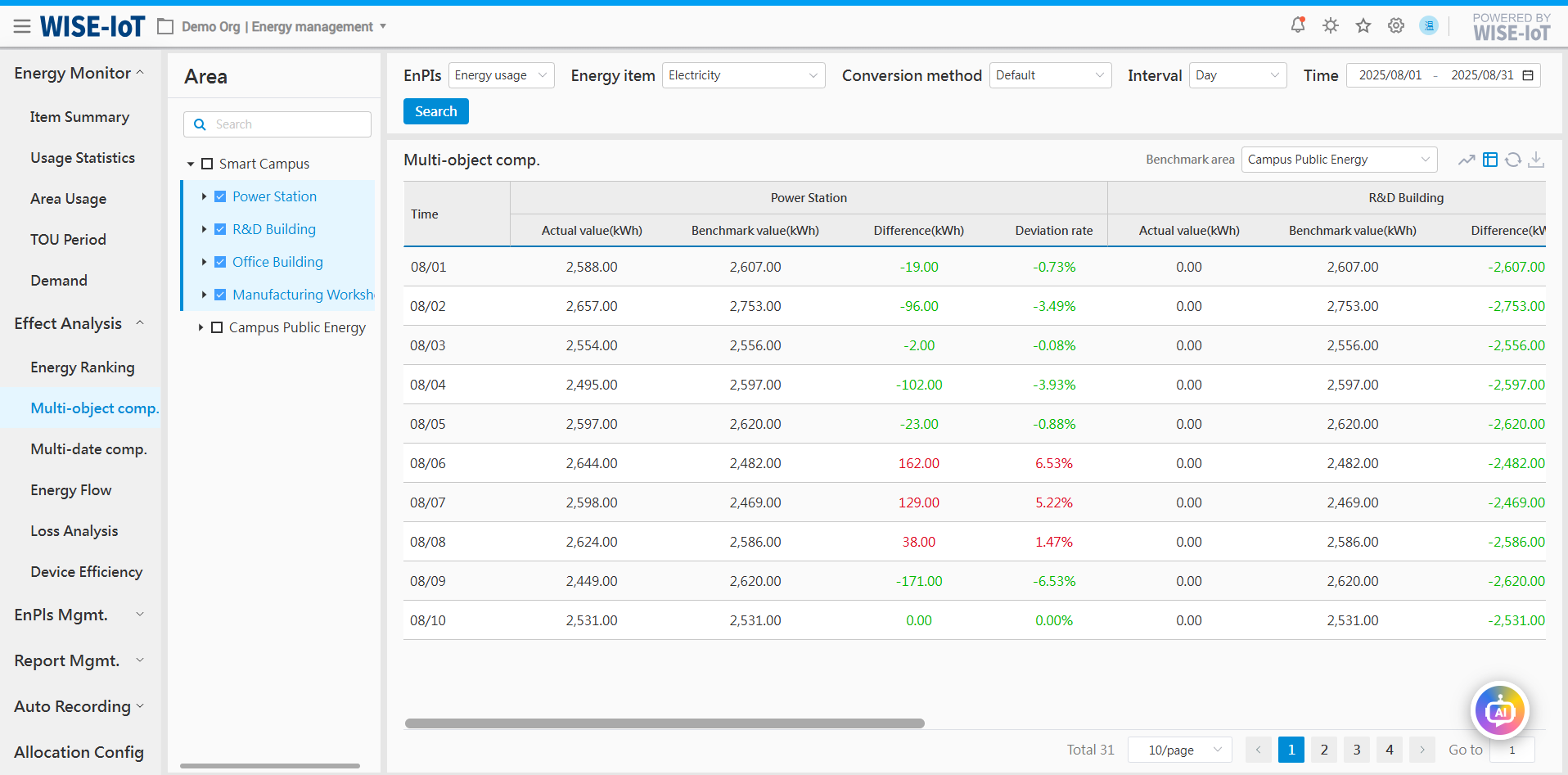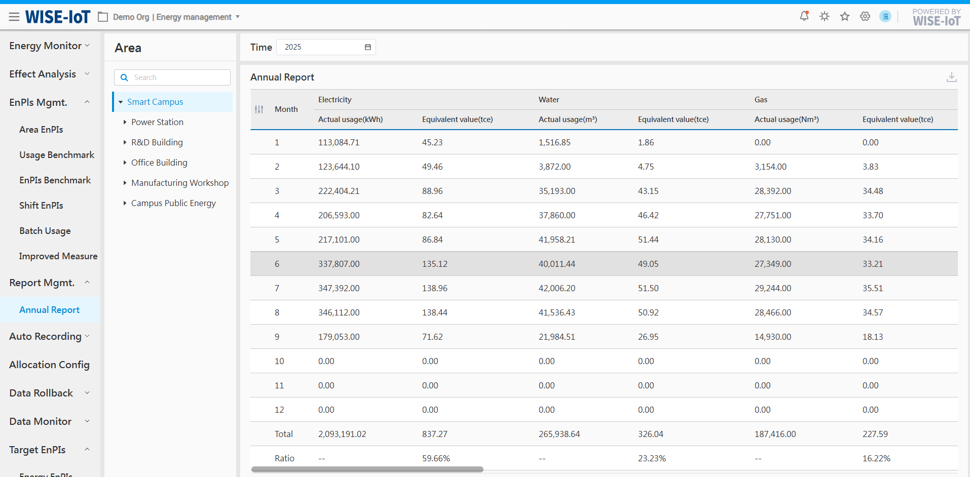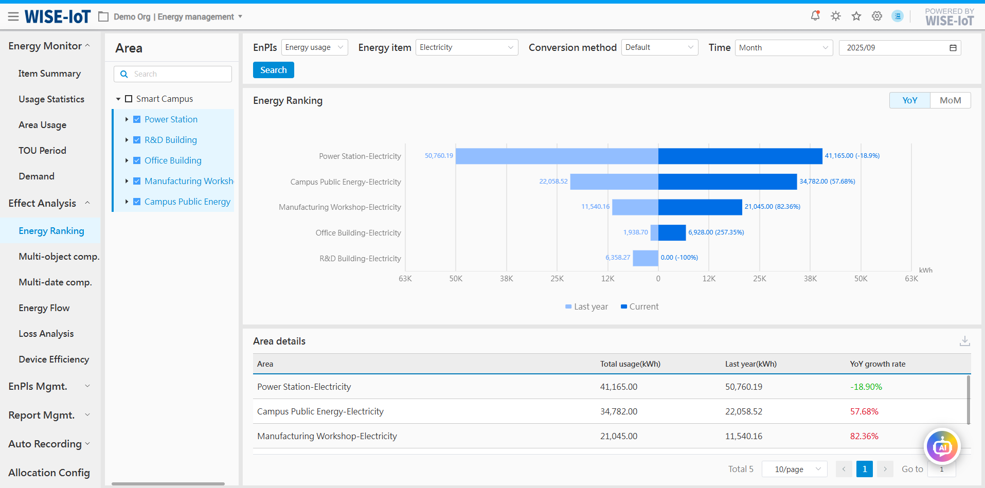 The module provides a holistic view of an enterprise's energy usage, displaying overall energy usage and usage by energy type. The energy medium statistics visible to users vary depending on the node in the interface.