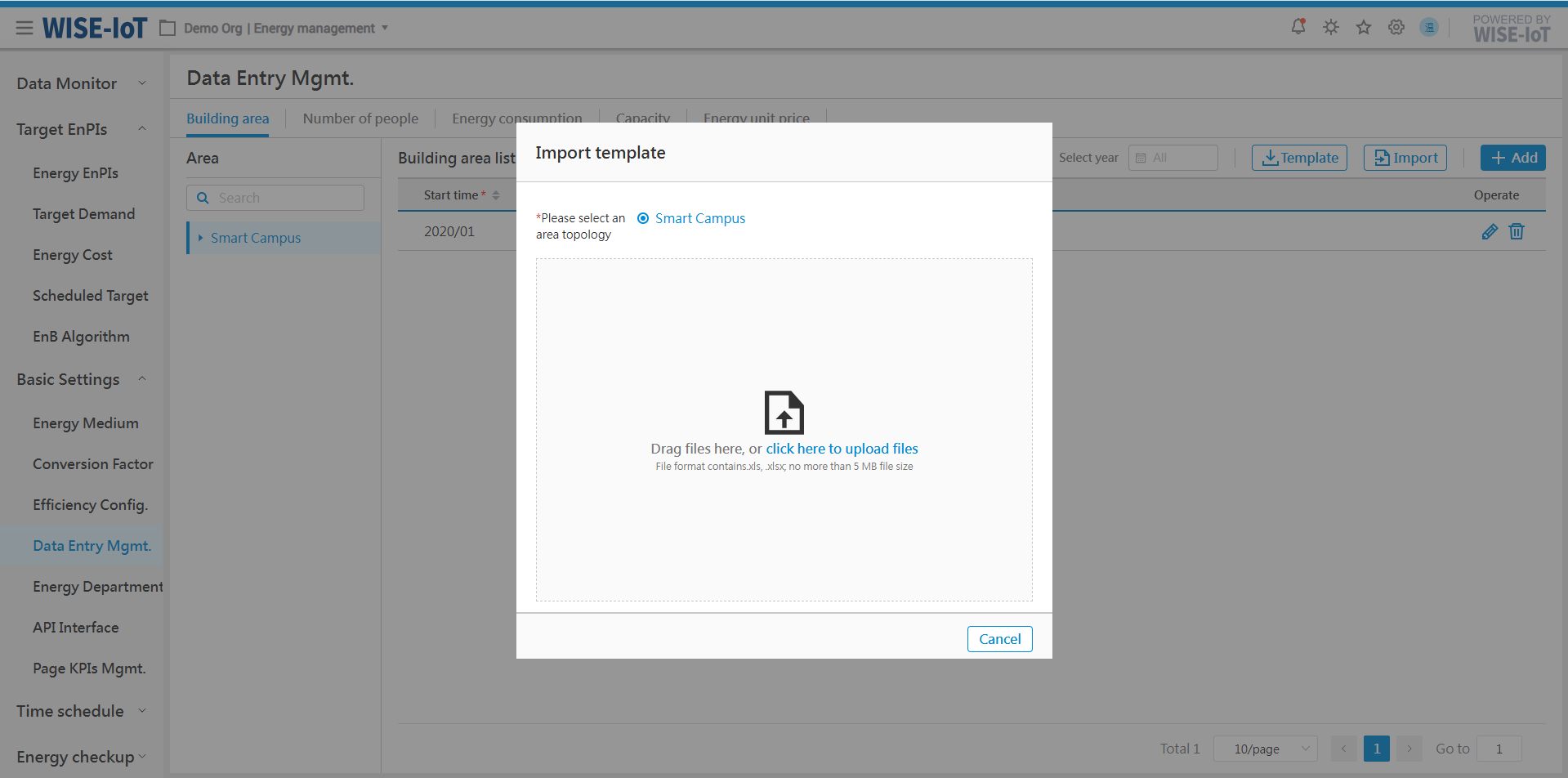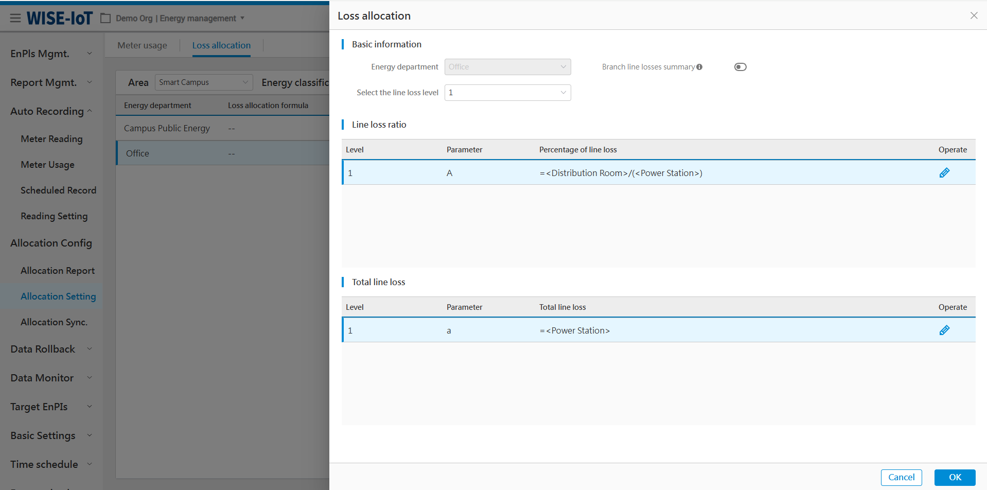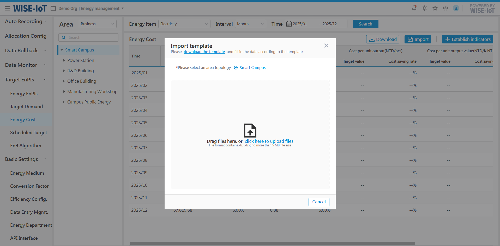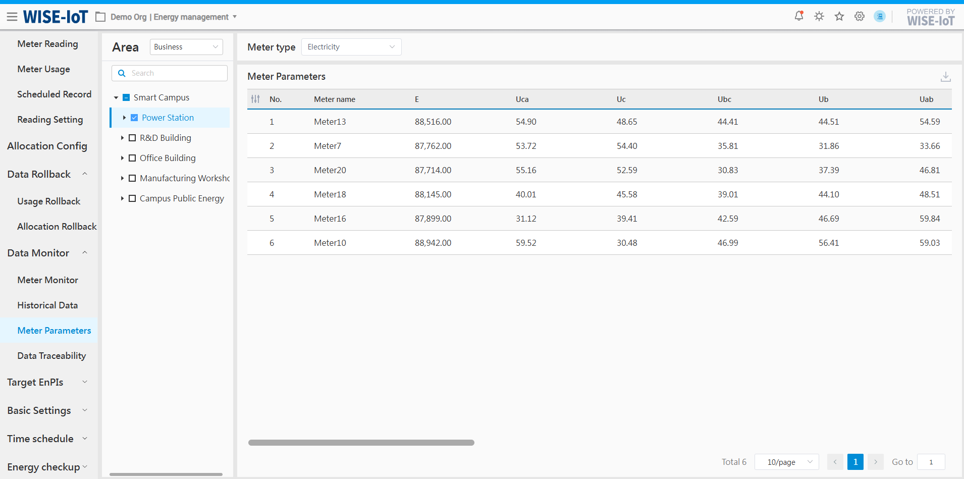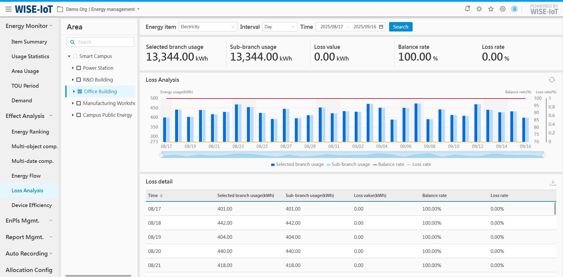 The module provides a holistic view of an enterprise's energy usage, displaying overall energy usage and usage by energy type. The energy medium statistics visible to users vary depending on the node in the interface.