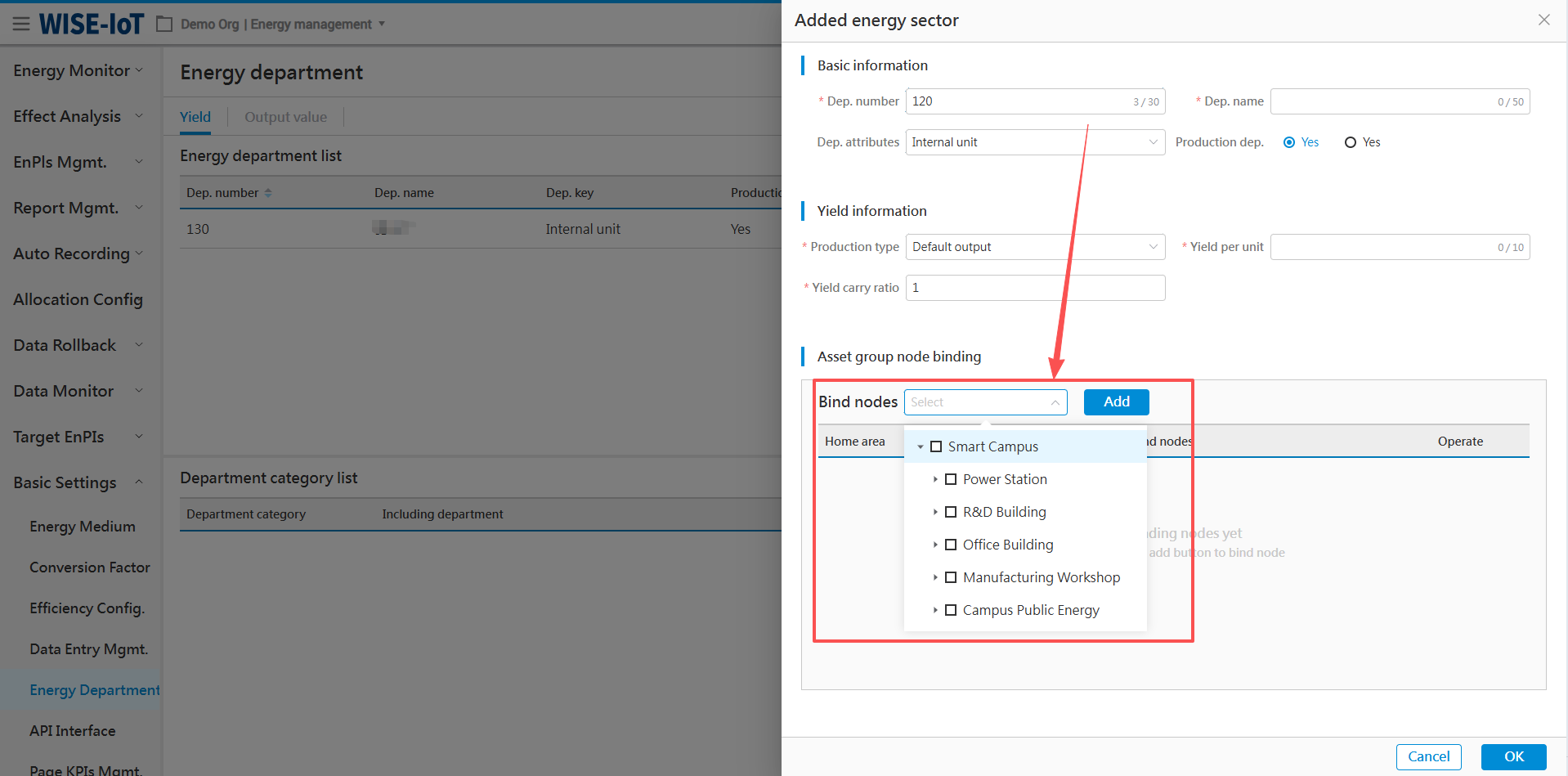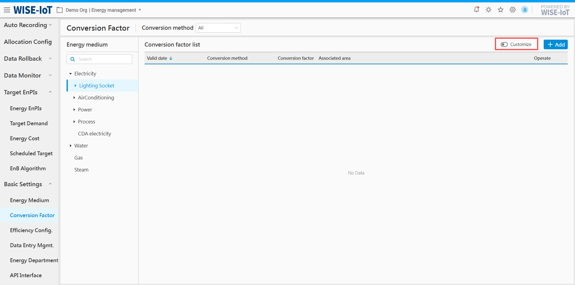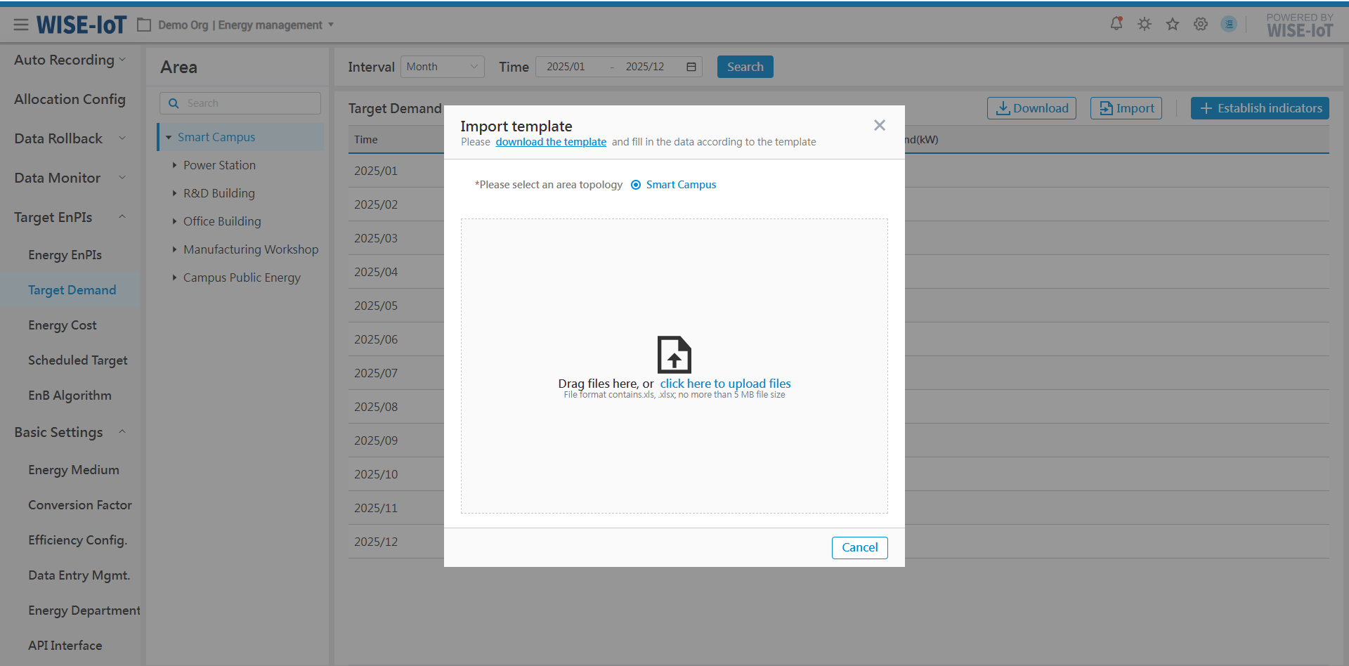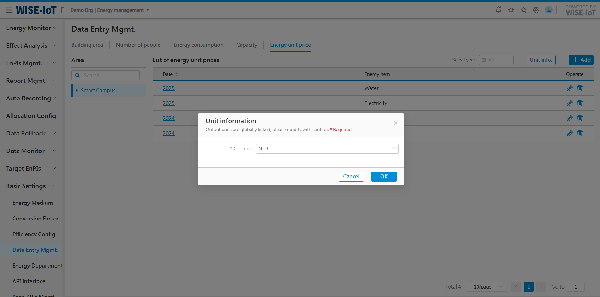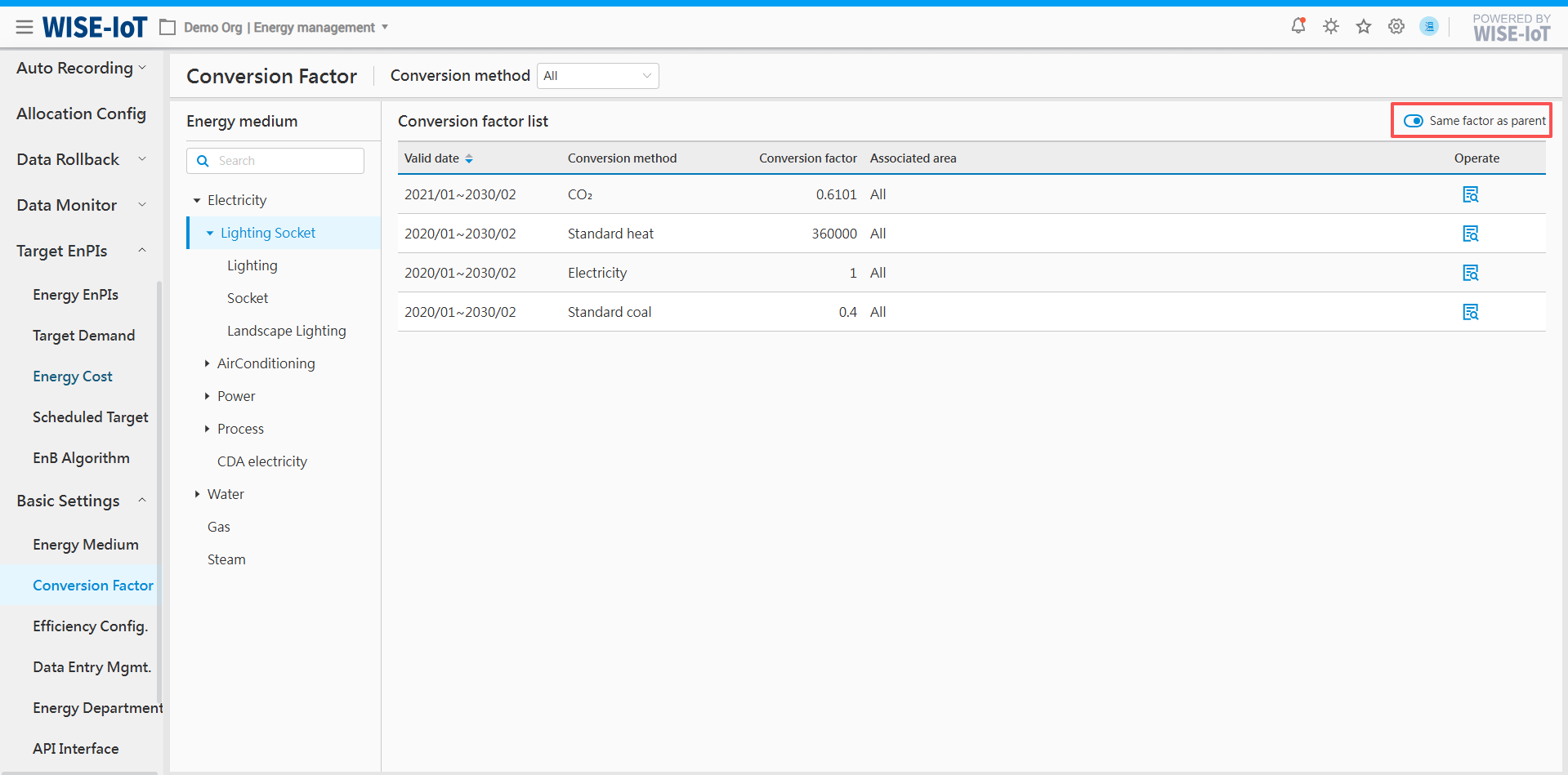 The module provides a holistic view of an enterprise's energy usage, displaying overall energy usage and usage by energy type. The energy medium statistics visible to users vary depending on the node in the interface.