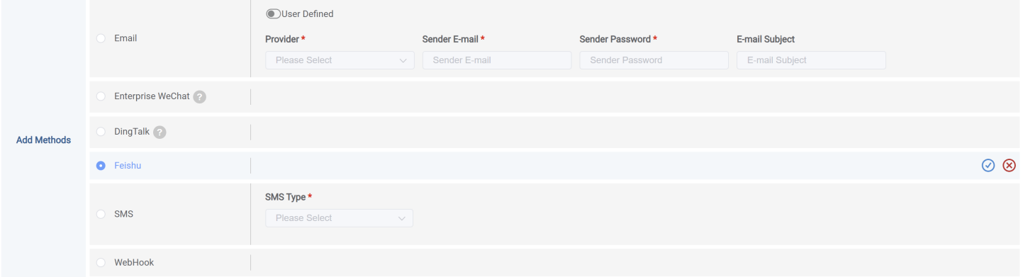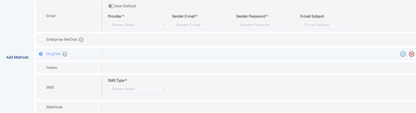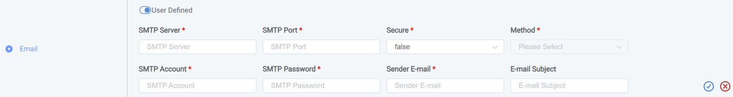 If the above 4 types of email push method do not meet requirements, click "User Defined", you can then customize the email settings. You need to fill in the following information, where * represents a required field.
