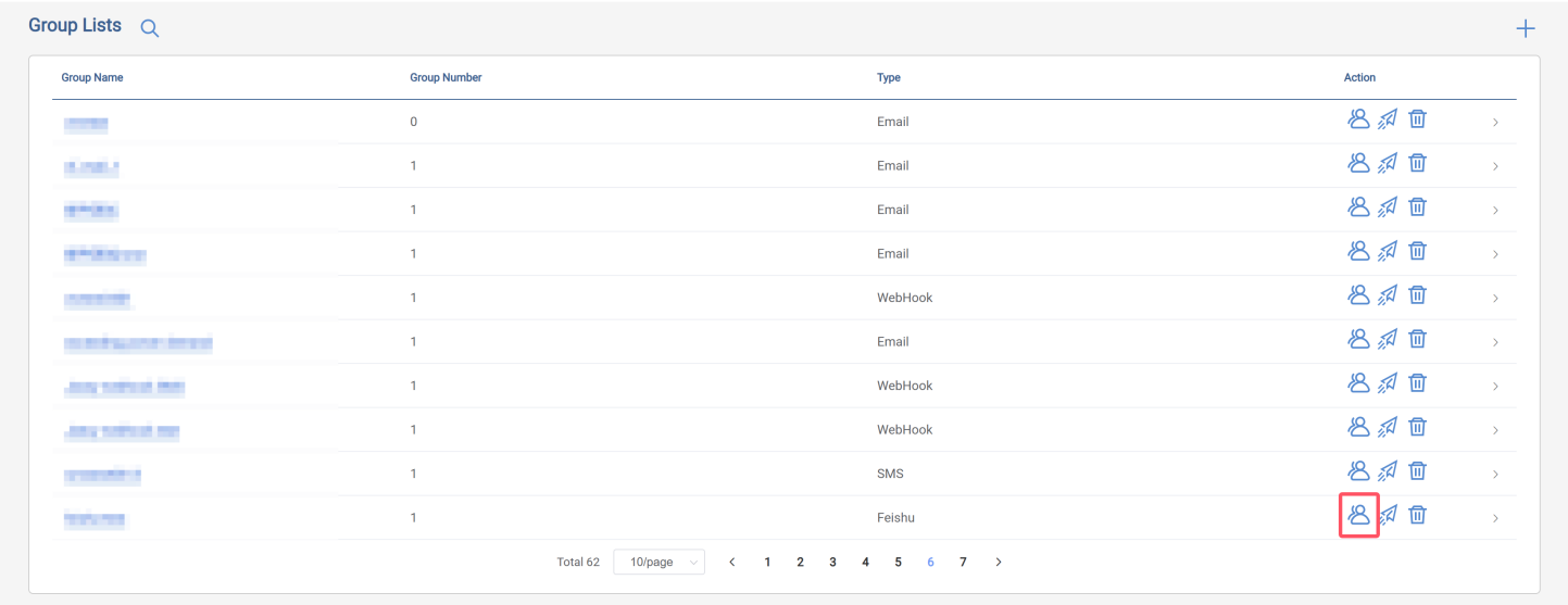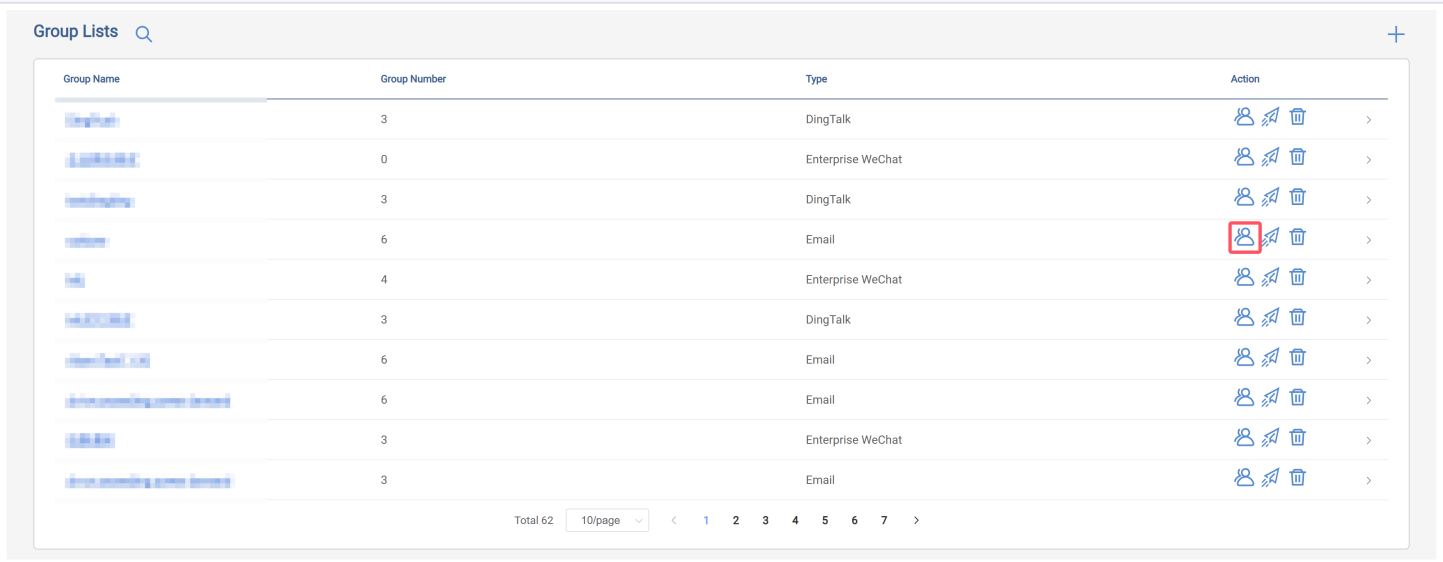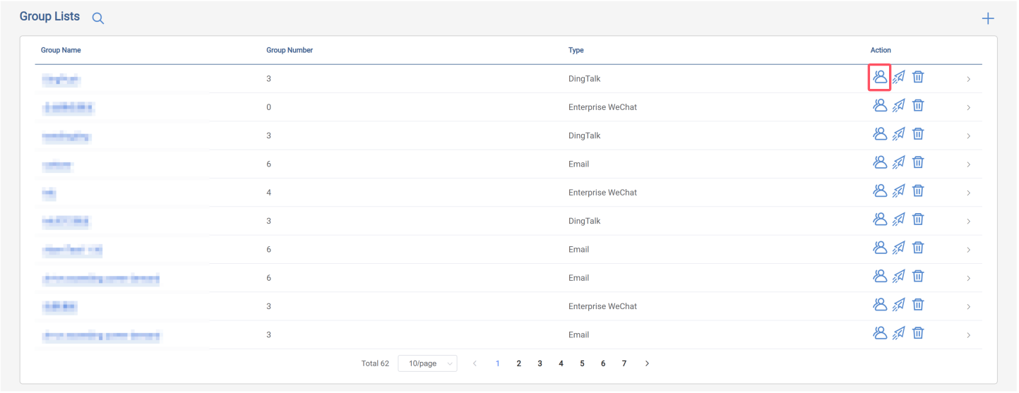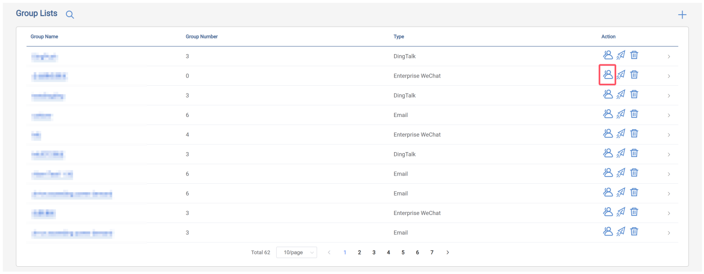 - At Group List select DingTalk notification method, click the right side of the "button", enter the personnel addition page.