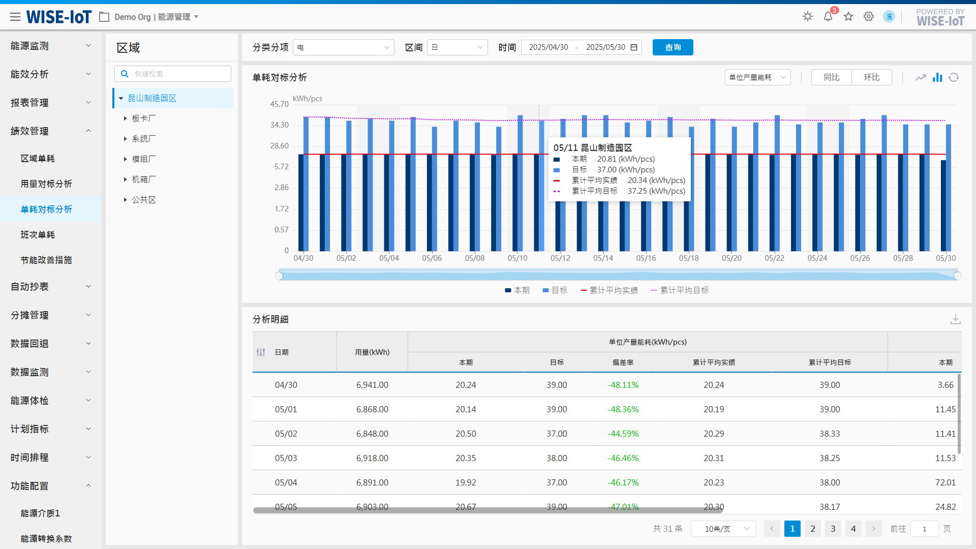 (3) Overall energy usage: Display the actual usage, target usage, target usage variance, usage during the same period last year and year-over-year usage variance during the selected time period.