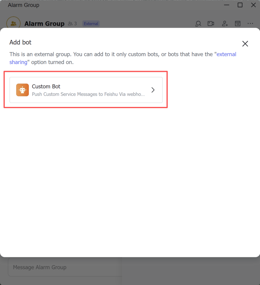 Web Hook URL: Input "Feishu" group Webhook URL, the steps to obtain this information are as follows: