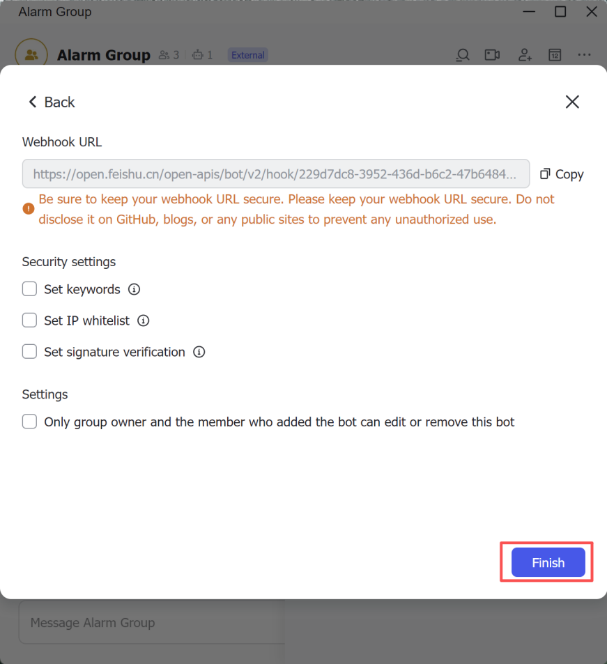 - "Feishu" group information already exists, fill in "Feishu" Webhook URL. Please fill in the following information: