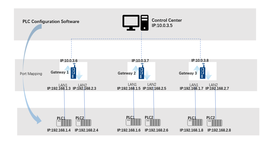 For example, a PC (control center) establishes a network connection with the gateway via VPN. The gateway's LAN1 IP is: 192.168.1.3, and the IP of the PLC connected to LAN1 is: 192.168.1.4. The PLC communication software uses a communication port of: 100.