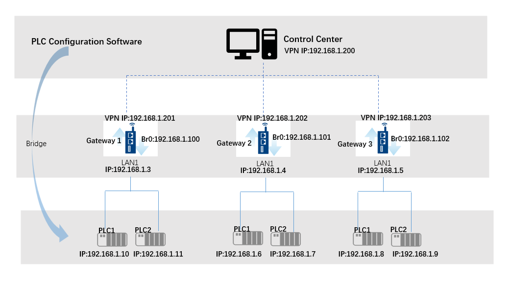 When a single Ethernet port of the gateway connects to multiple PLCs (if there are multiple gateways on site, please note: the IP addresses of the PLCs connected under each gateway must not be duplicated), remote operation and maintenance can be achieved using network bridging.(Please set the VPN to tap mode)