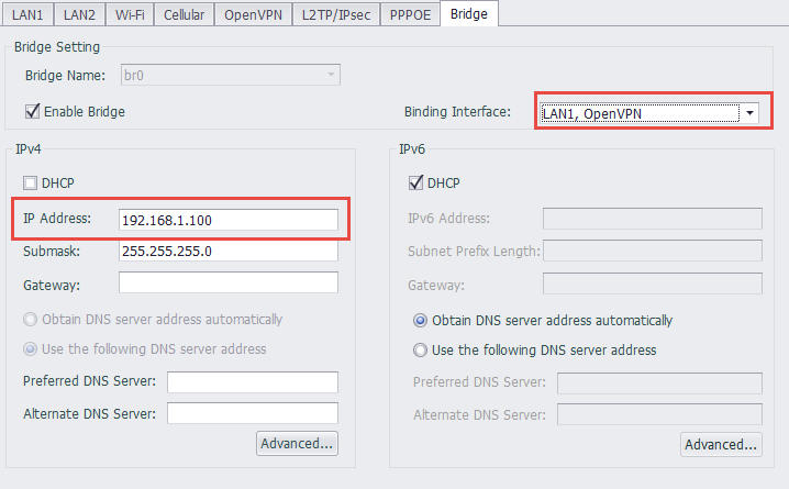 Use EdgeLink Studio to set up the VPN and LAN1 bridge together, and download it to the gateway. For example, set the br0 IP to: 192.168.1.100.
