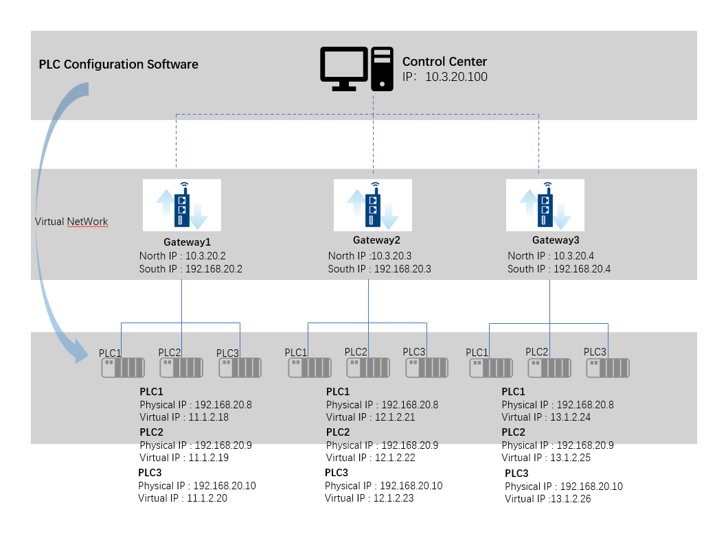 When a single Ethernet port of the gateway is connected to multiple PLCs, and the IP addresses of the PLCs connected under multiple gateways are duplicated, virtual networking functionality is required to achieve remote operation and maintenance. (Scenarios 1 and 2 can also be achieved through virtual networking, but port forwarding and network bridging configurations are simpler and easier to get started with, so the methods for scenarios 1 and 2 are recommended.)
