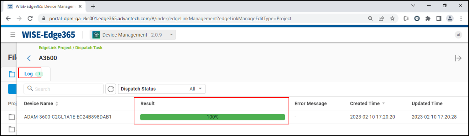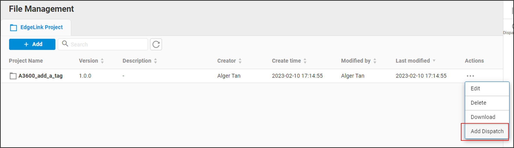 2. Find the corresponding project file in EdgeSync 360/EdgeHub and click Add Dispatch