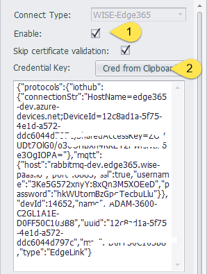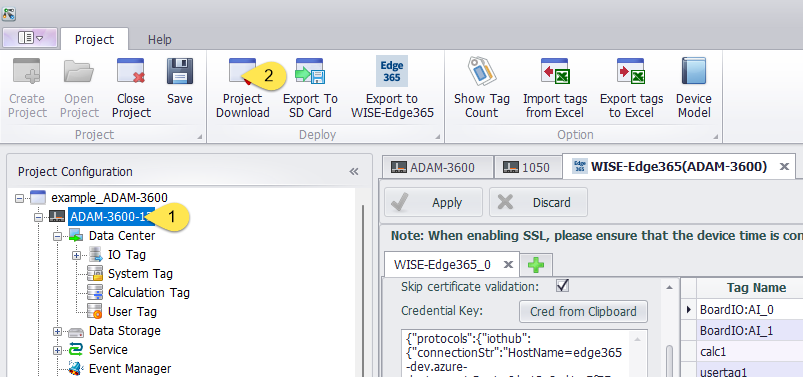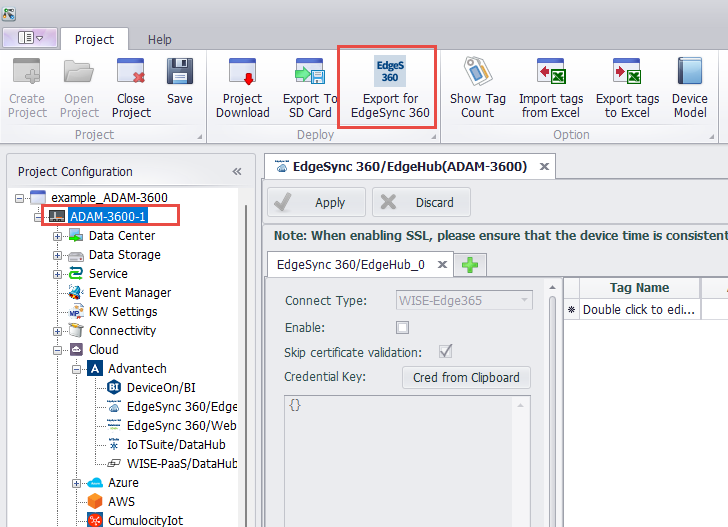1. Open the EdgeLink Studio project configuration page for EdgeSync 360/EdgeHub by selecting "Project" > "Cloud Service" > "Advantech" > "EdgeSync 360/EdgeHub", and enable the connection