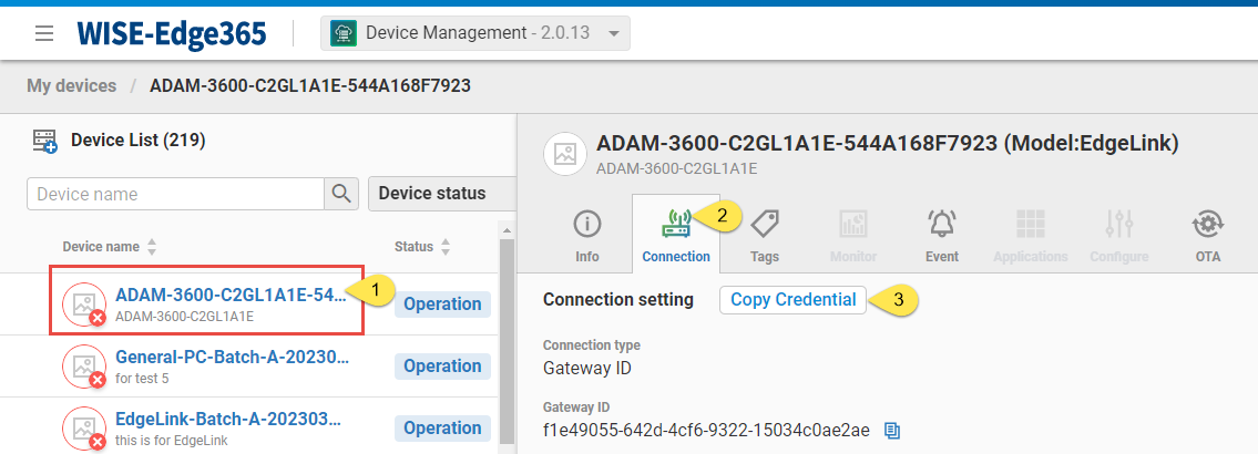 1. Click on the newly added device, and the device information will appear on the right side. Copy the "Credential" to the clipboard