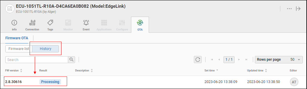 6. At this point, the user can click on "History" under "Firmware OTA" to view the current upgrade status