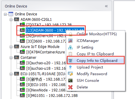 1. In EdgeLink Studio, select the online page for the gateway you want to add to EdgeSync 360/EdgeHub, right-click, and choose "Copy device information to clipboard"