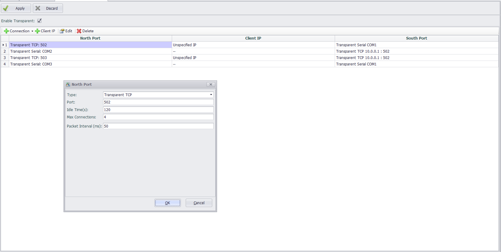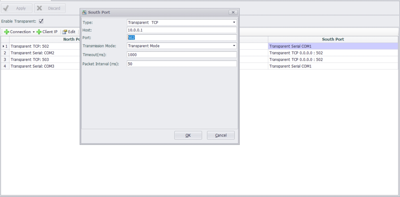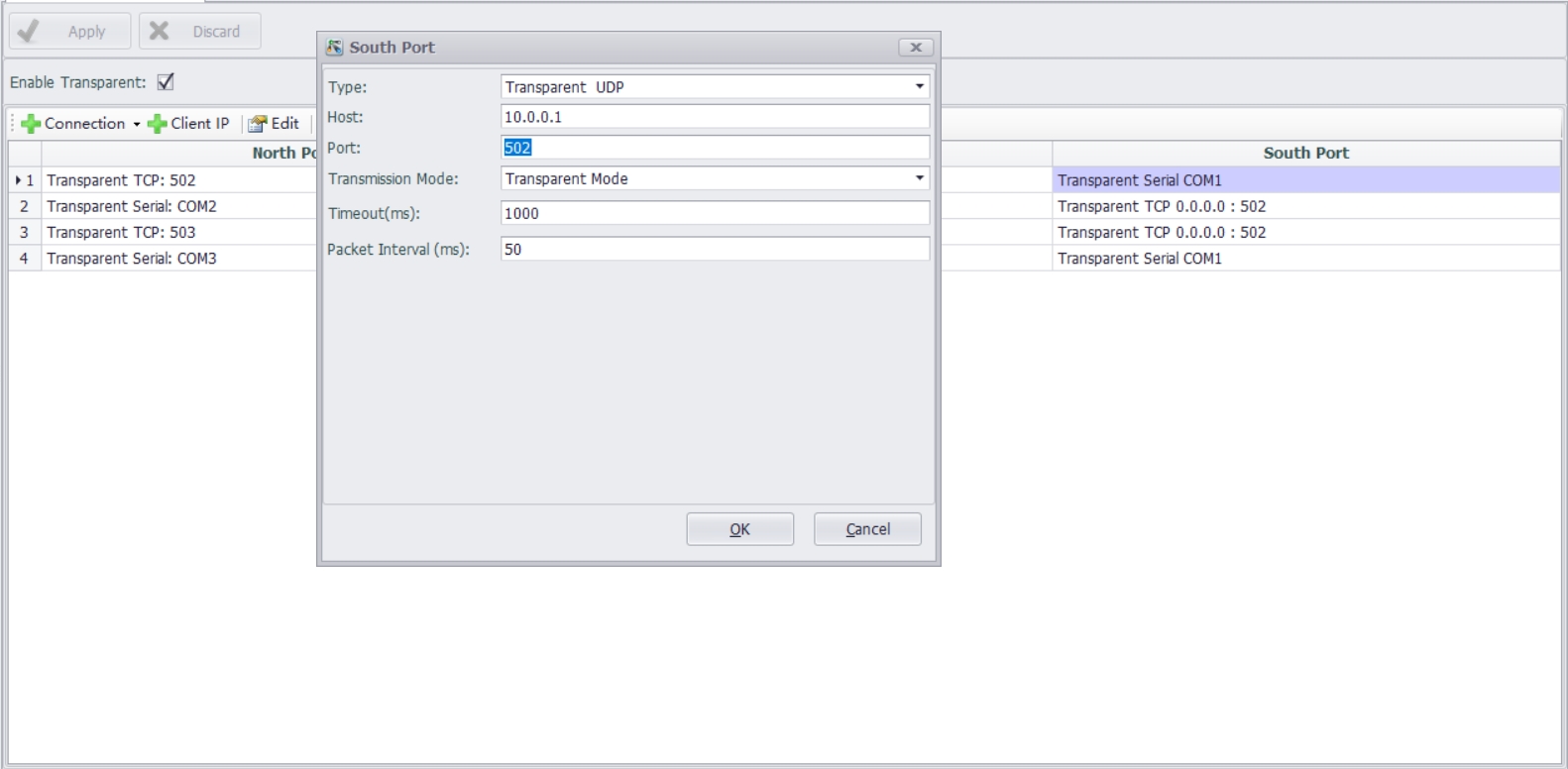 Note: When the northbound communication link is via network communication, Transparent Mode can only be enabled if either the maximum number of northbound TCP connections is 1, or the IP whitelist for northbound UDP/TCP is configured with a specific unique IP.
