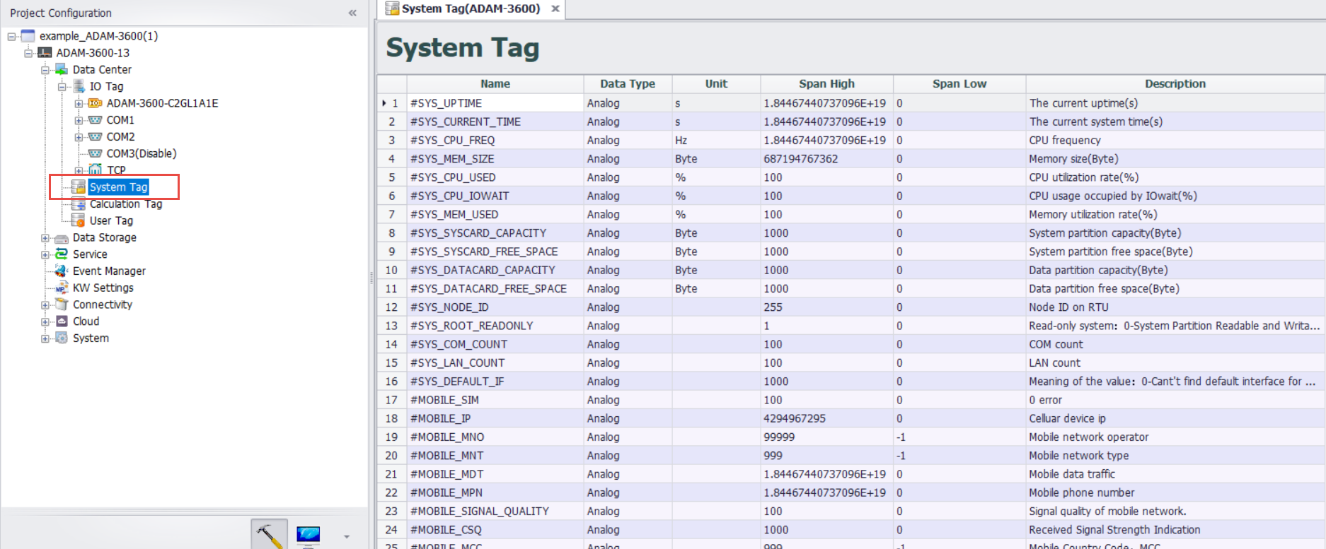 - #DEVICE_ERROR_MeterName : Read-only, each meter in the DataCenter has its own tag, distinguished by the name of the meter. The error code when the current meter is collecting errors. For example, if the instrument name is TestDevice1, there will be a corresponding system tag #DEVICE_ERROR_TestDevice1, through which the current meter collection status can be viewed