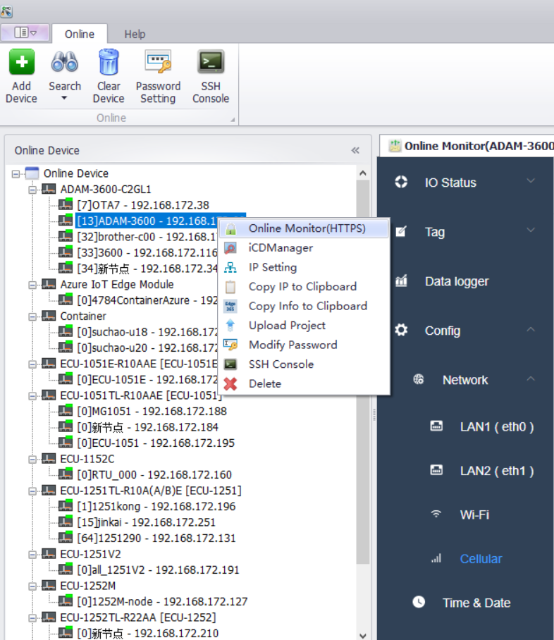 Advantech EdgeLink Studio supports online device operations and has the following main functions: