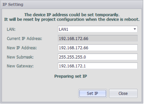Users can temporarily modify the IP address and subnet mask of the network port of online devices through EdgeLinkStudio. For example, the two network ports of RTU are set to DHCP mode (dynamically assigned IP), but there is no server in the network that can provide DHCP services. At this point, the RTU can be searched, but not accessed by IP. At this time, the user can temporarily set the IP address of the RTU for operations such as downloading projects.