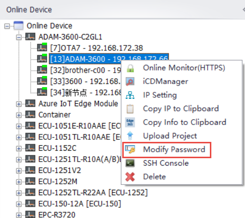 The second case: Right-click on a specific online device and select Change Password to modify the password of the current device