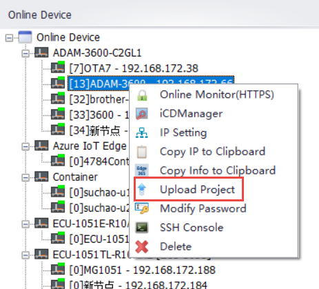Right-click on the already searched device and select "Upload Project" in the Online device list to start uploading device information.