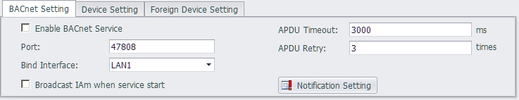 Device Setting: To define the properties of this device object. Please make sure the device instance is the unique in one whole BACnet network.