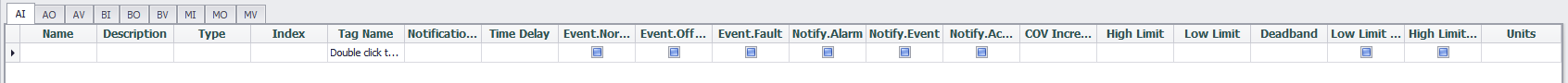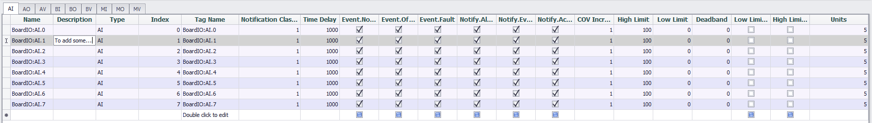User can add new BACnet object by [Double click to edit], then will mapping an EdgeLink Tag to this BACnet Object, and the system will auto create the object instance index for you, please keep the continuity of the index, and the system will start from index 0.