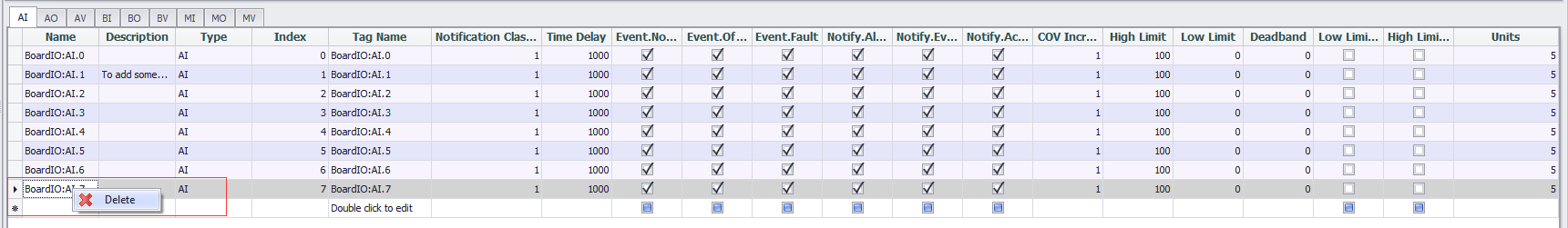 User can delete the existed BACnet obejct, select one or more lines and then right click to call [delete] popup menu out then to delete it.