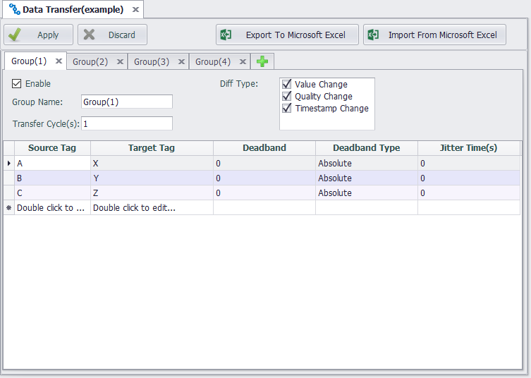 According to the configuration in the above figure, the Data Transfer program will transfer the tag values (A=>X, B=>Y, C=>Z) per second, or on detection of any change of the source tag's value, quality, and time stamp.