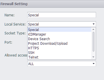 The firewall contains local services including "Modbus", "DNP3", "IEC104", "BACnet", "NTP". These services will add this service when enabled the default settings to the firewall restrictions.When the service is disabled, all relevant settings in the firewall will be removed.